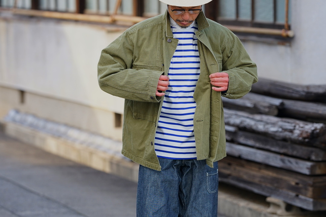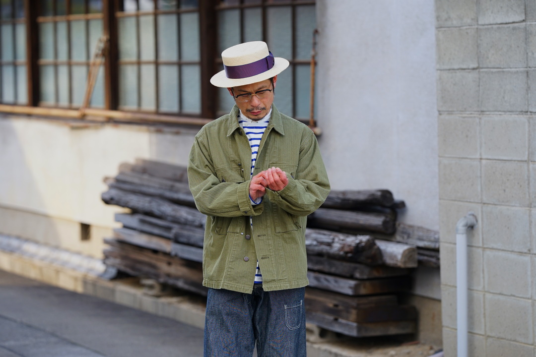 BUZZ RICKSON’S BR14831 ”JACKETS, HERRINGBONE TWILL, SPECIAL TYPE M-43″ 2021年3月10日 by Sweet Sue モデル 身長163cm体重56kg胸囲90cmウエスト78cm ・帽子 Speier’s (スピアーズ) カンカン帽 ・アウター BUZZ RICKSON’S (バズリクソンズ) HBTジャケット BR14831 ”JACKETS, HERRINGBONE TWILL, SPECIAL TYPE M-43″ オリーブ サイズ36・カットソー WORKERS (ワーカーズ) 長袖ボーダーTシャツ ”Henley Border Long” ホワイト×ブルー サイズ2 ・長袖シャツ JELADO (ジェラード) 長袖ワークシャツ AG21102 ”Ellis” ホワイト サイズ14 ・パンツ JOHN GLUCKOW (ジョン・グラッコウ) ワークパンツ JG94302 ”Net Maker’s Trousers” インディゴ Sサイズ ・ブーツ JELADO (ジェラード) 20sスタイルドレスシューズ JRS-1001 ”Gotham” ブラウン サイズ7.1/2